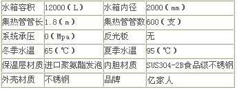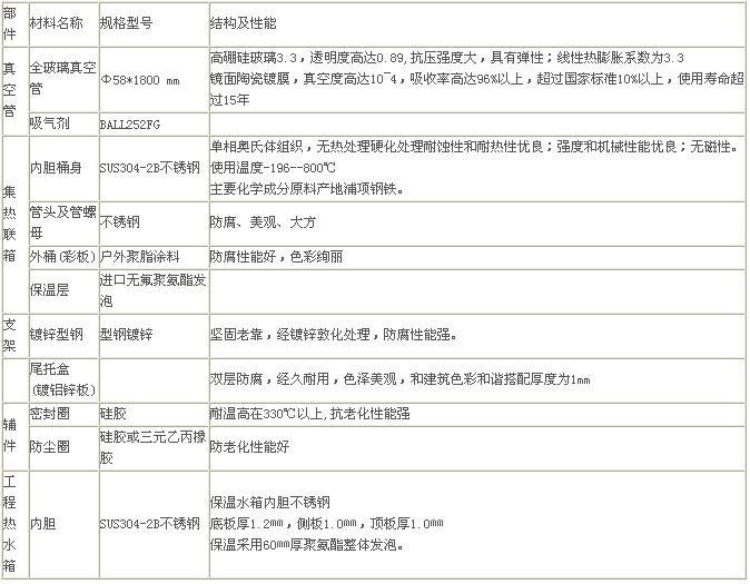 和國家性能對比表 真空管性能一覽表 2、聯(lián)箱主要參數(shù)表: 3、保溫水箱主要參數(shù)表: 4、聚氨酯發(fā)泡性能表: 5、支架參數(shù)