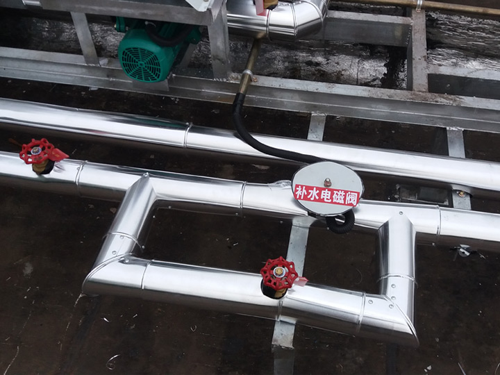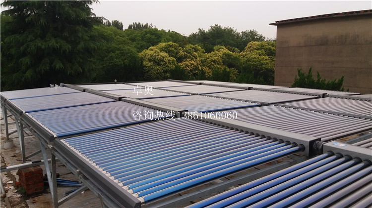 工程明細:18組太陽能集熱模塊,3臺5匹空氣能熱水機,2個8噸不銹鋼保溫水箱